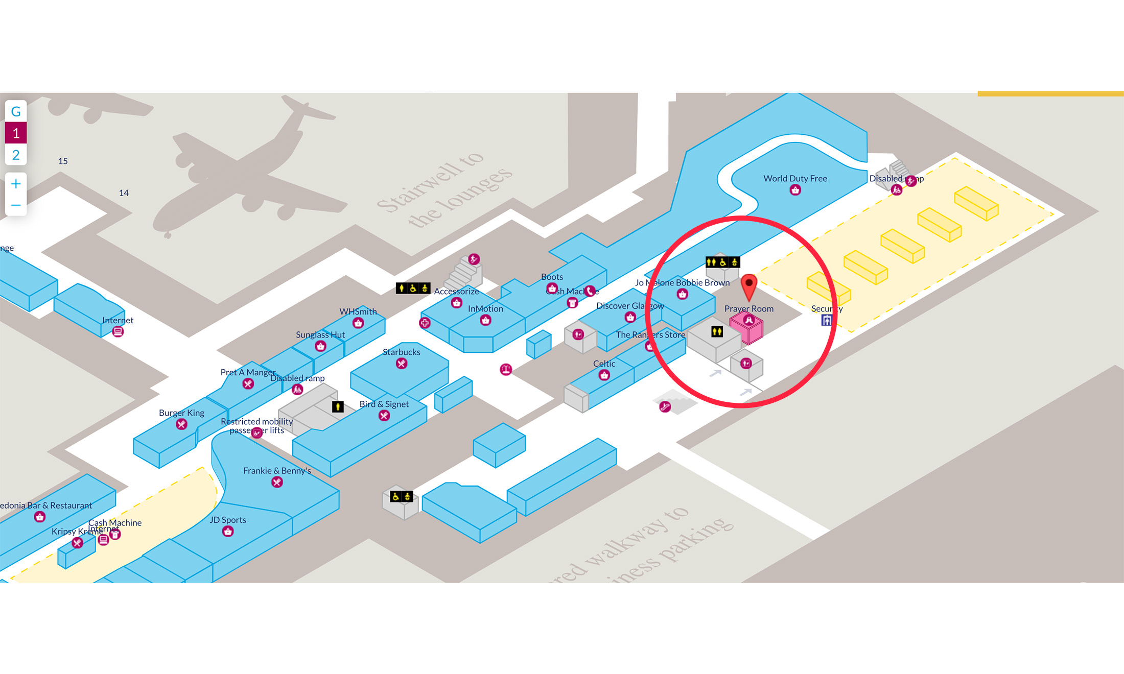 Prayer Room Locations in Glasgow Airport Glasgow Airport offers 1 prayer room, which is available 24 hours a day, 7 days a week. Prayer Room in Glasgow Airport First Floor | Before Security | Departure Located on the first floor of the departures concourse, in the Priority Security Corridor